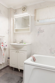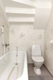Badrum: Plastmatta. Väggar: Målad tyg. Tak: Vitt takplattor. Inventarier: Toalett och handfat integrerade i skåpet.