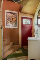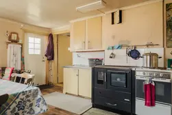 Köket har heltäckningsmatta, gulmålade väggar och vitt tak. Det har en vedspis, en elektrisk spishäll och gula köksskåp. Härifrån når du husets baksida.