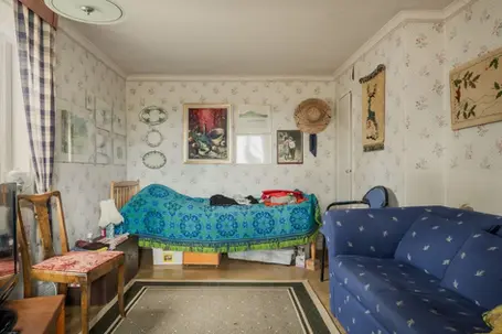 Ett rum med heltäckningsmatta och tapetserade väggar, som för närvarande används som både sovrum och vardagsrum. Det erbjuder plats för en liten soffa och andra möbler.
